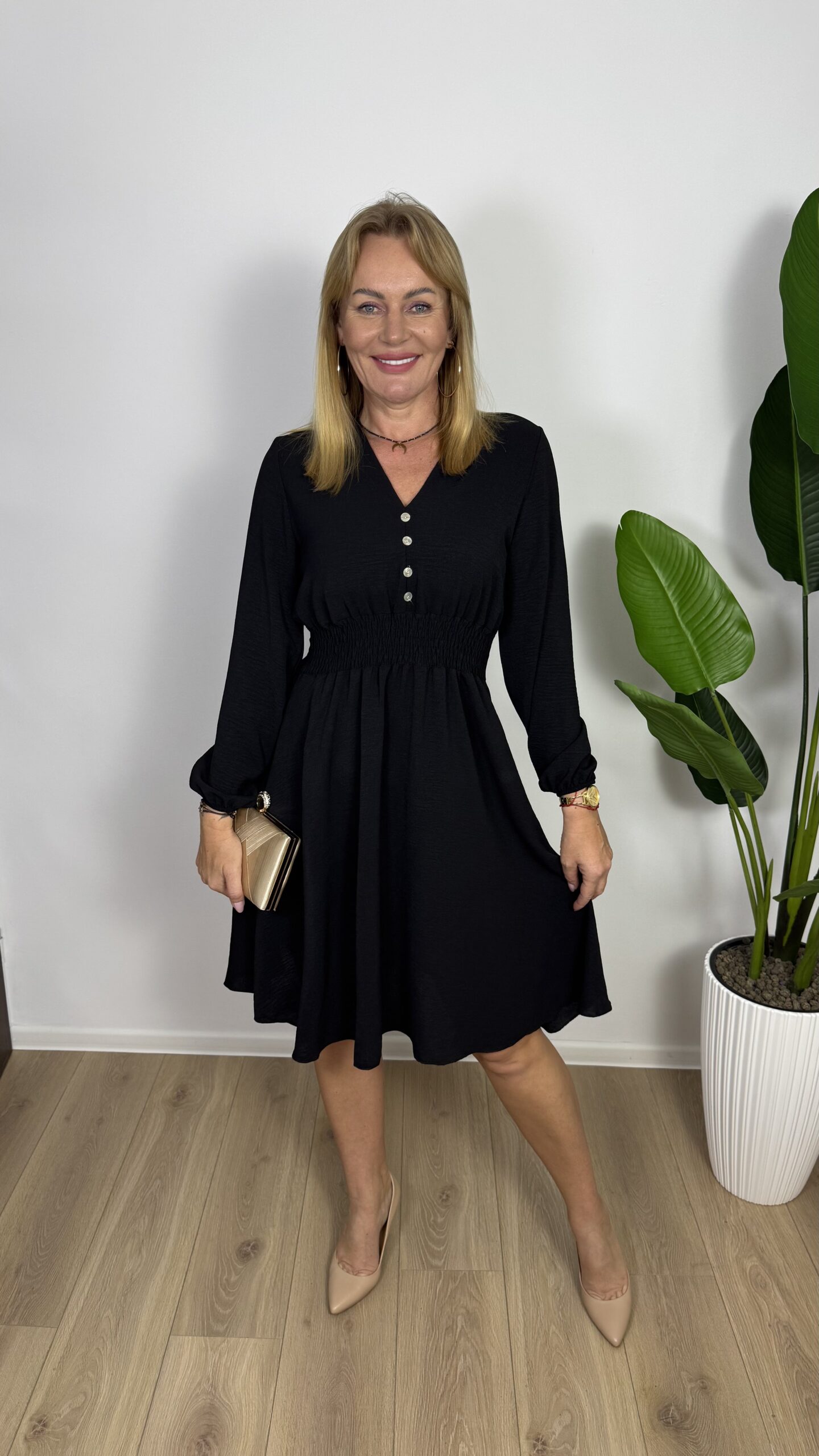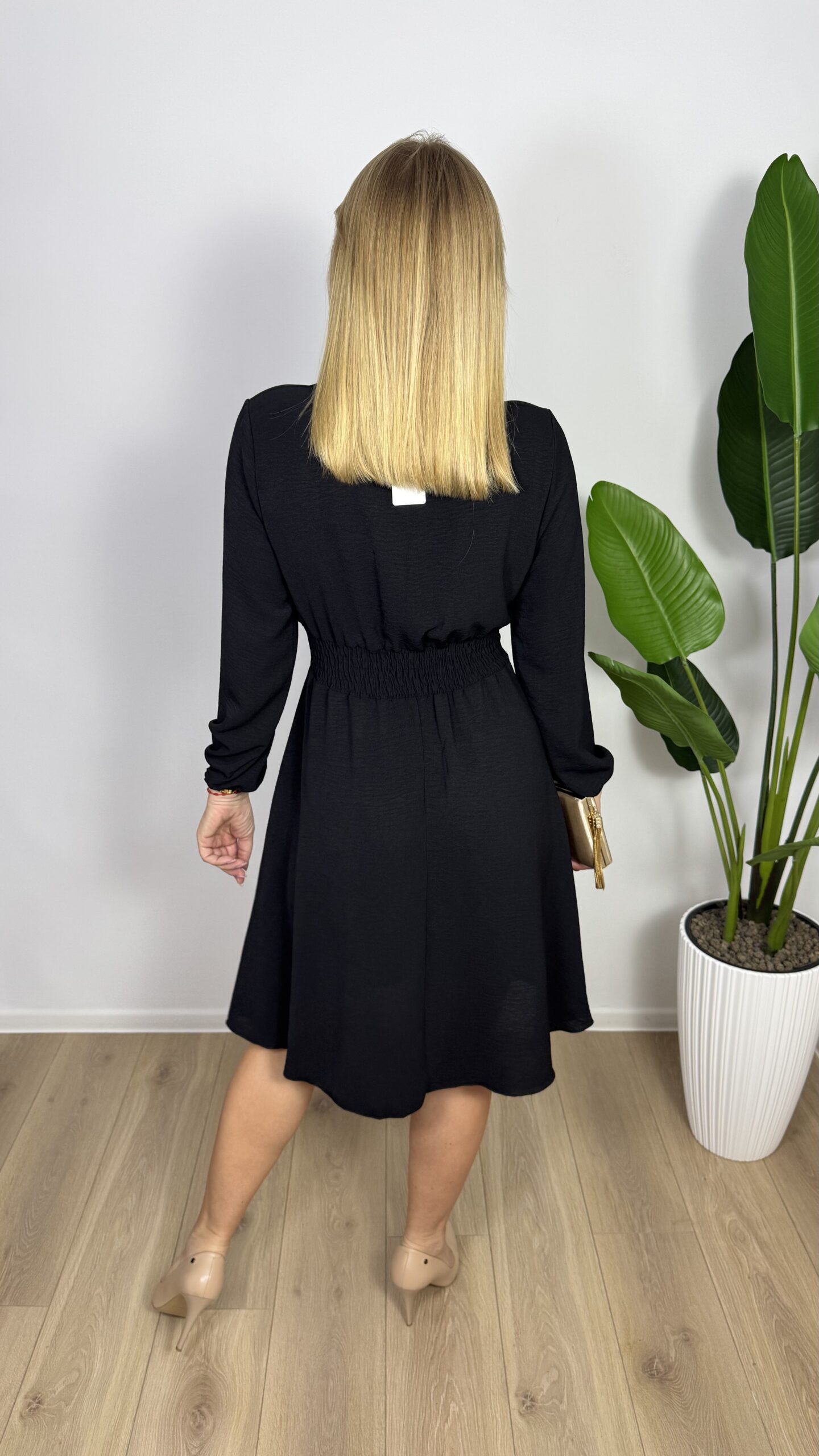 Uniwersalna i kobieca sukienka z pięknym dekoltem i pięknymi guziczkami na piersiach. Idealna na co dzień, do pracy, ale także na spotkania czy rodzinne uroczystości . Ta sukienka prezentuje się zarówno ze szpilkami, trampkami czy kozakami. Lekki materiał rozkloszowany dół daje jej pięknego uroku i kobiecego wyglądu.